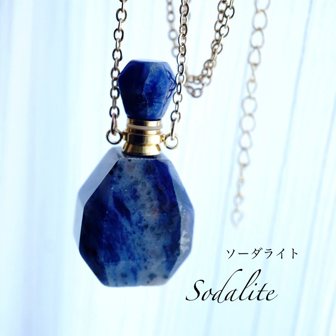天然石ソーダライトの香水瓶ネックレス。